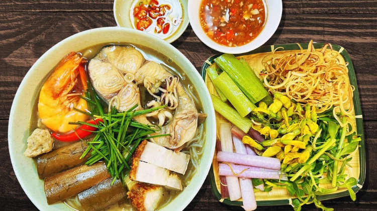 Um prato com sabor ocidental, mas adorado na Cidade de Ho Chi Minh. Caldo rico feito de molho de peixe de Linh e molho de peixe de Sac, servido com carne de porco assada, camarão, lulas, beringela, vegetais crus, etc.