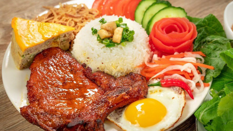 Um prato "nacional" do povo de Saigão, especialmente ao pequeno-almoço. O arroz partido é frequentemente consumido com costelas grelhadas, ovos estrelados, pele de porco, rolinhos primavera e molho de peixe agridoce. O aroma das costelas grelhadas espalha-se e é irresistível.